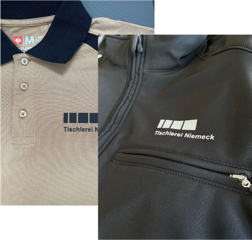 Außerdem kennen wir die genauen Positionen, an denen das Logo platziert werden soll – vom oberen Brustbereich bis zum großflächigen Rückendruck. Auf diese Weise entstehen einheitlich gestaltete Kleidungsstücke, die das Corporate Design der Tischlerei Niemeck unterstreichen und für einen hohen Wiedererkennungswert sorgen.